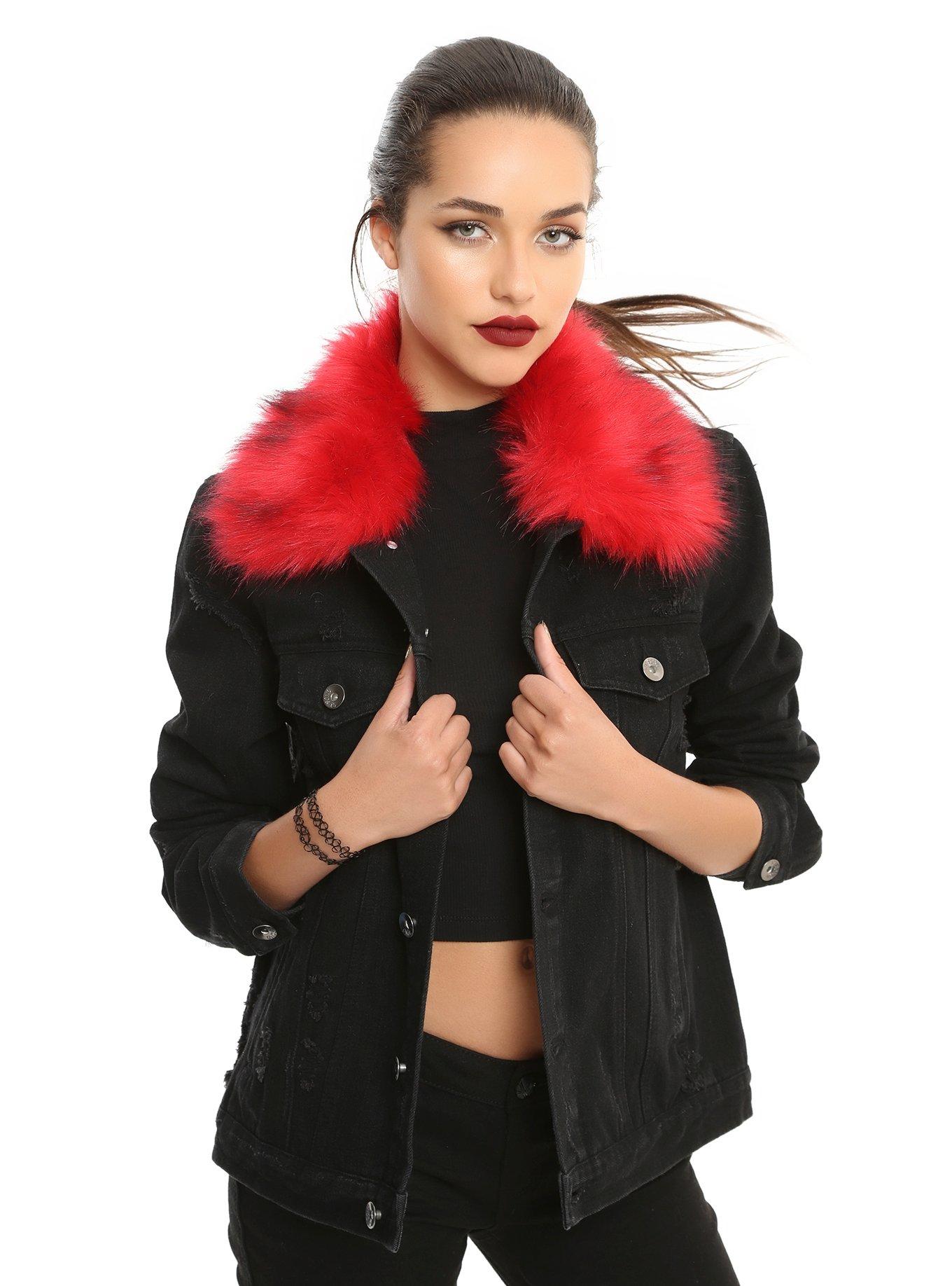 Red fur cheap denim jacket