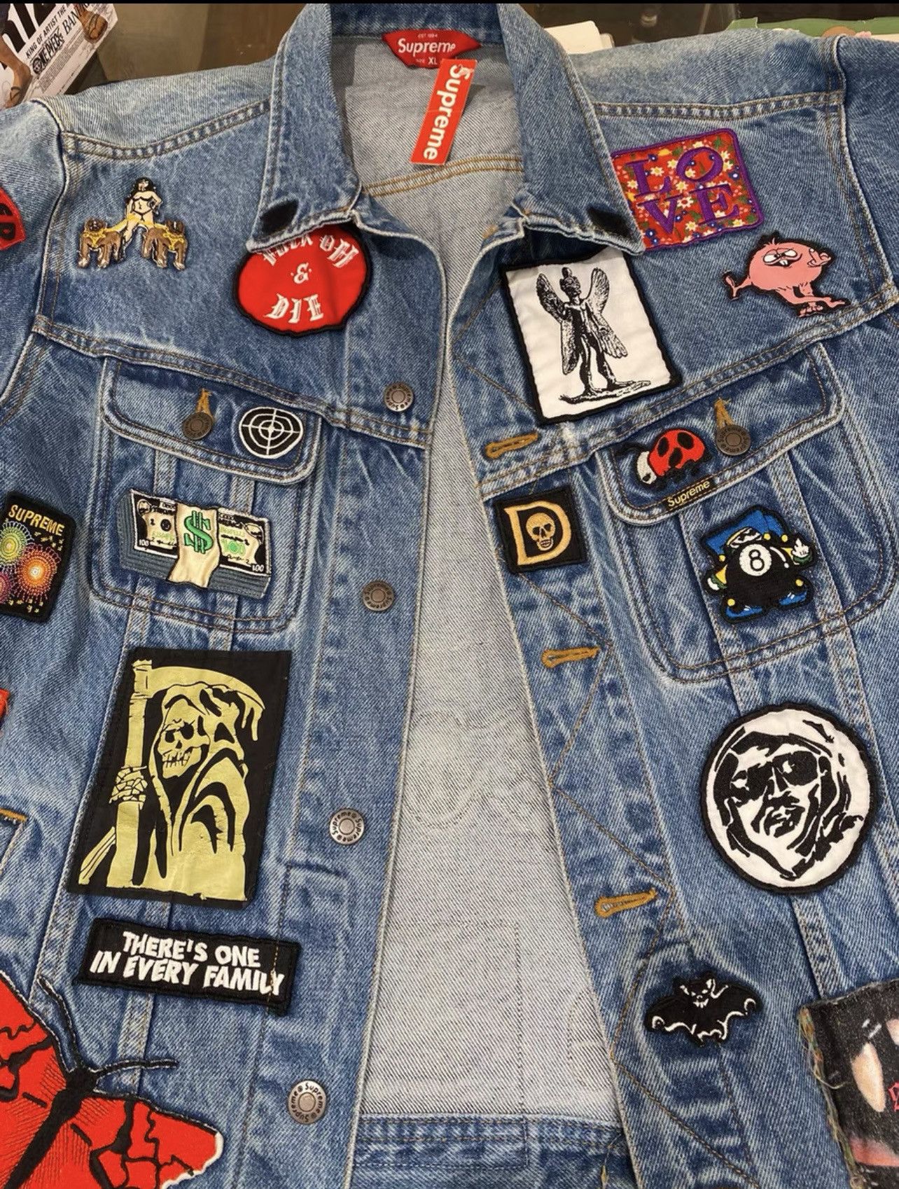 Product Item: Supreme patches denim cheap trucker jacket blue