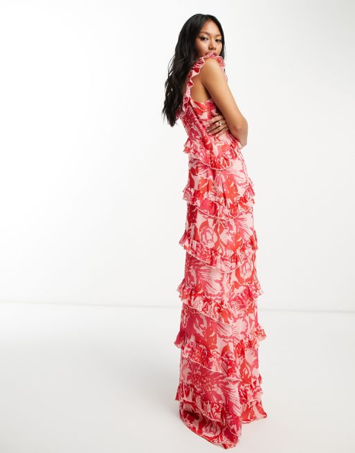 Asos design wrap maxi dress with cheap frills in red floral print