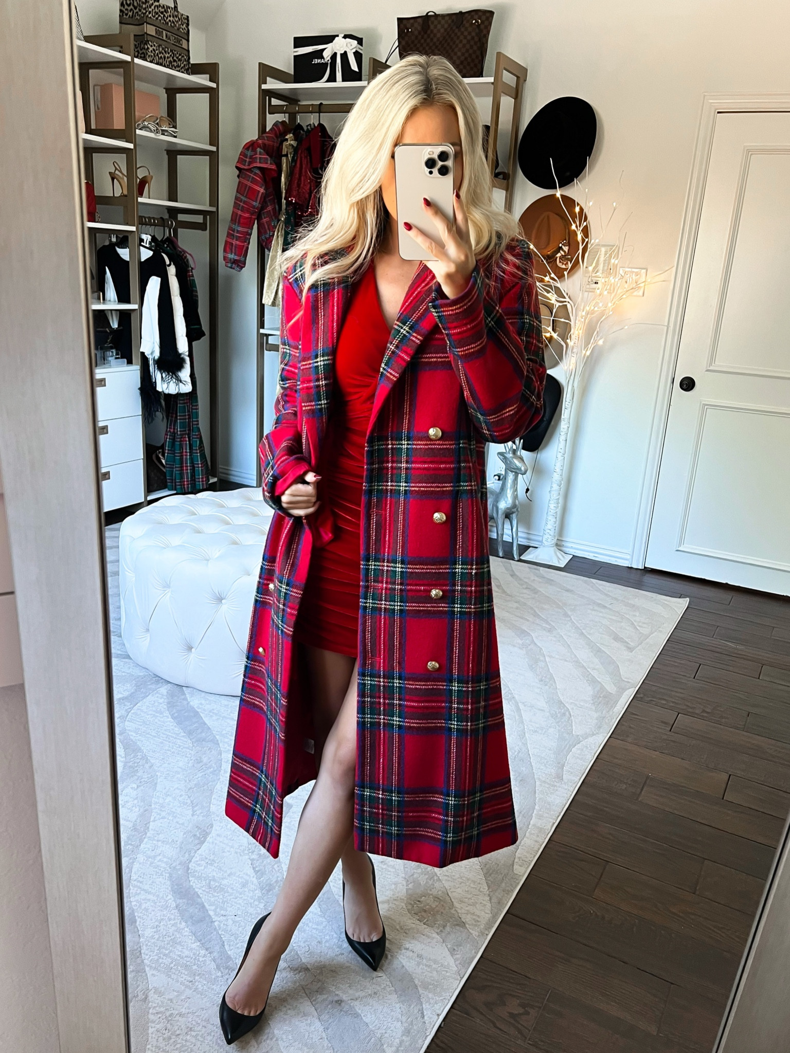 Long red cheap plaid coat